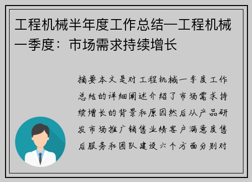 摘要:本文是对工程机械一季度工作总结的详细阐述。介绍了市场需求持续增长的背景和原因。然后,从产品研发、市场推广、销售业绩、客户满意度、售后服务和团队建设六个方面,分别对工程机械一季度的工作进行了详细分析。总结归纳了工程机械一季度的工作成果和存在的问题,并提出了下一步的改进方向。