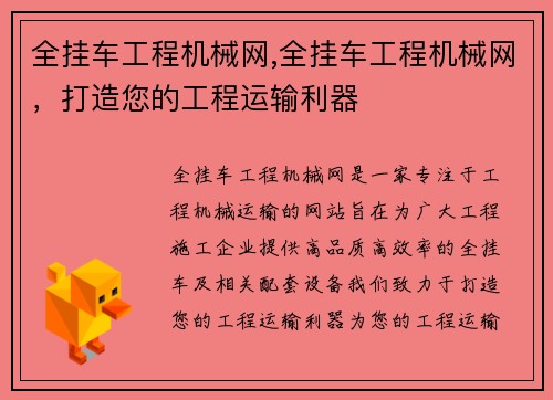 全挂车工程机械网是一家专注于工程机械运输的网站,旨在为广大工程施工企业提供高品质、高效率的全挂车及相关配套设备。我们致力于打造您的工程运输利器,为您的工程运输提供一站式解决方案。无论您是需要挖掘机、装载机、压路机等工程机械的运输,还是需要特殊货物的运输,我们都能为您提供最优质的服务和最合适的解决方案。